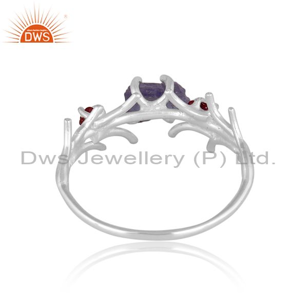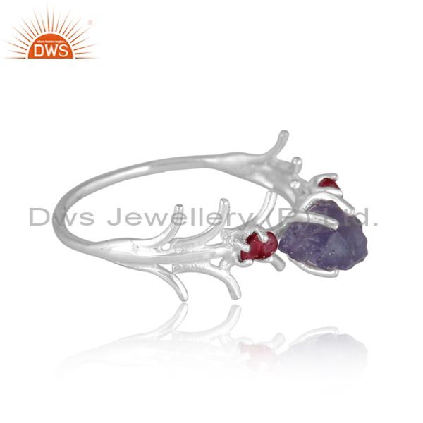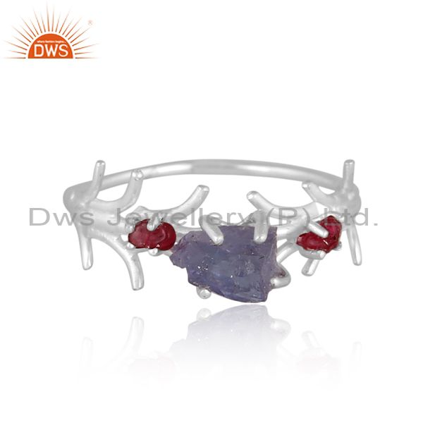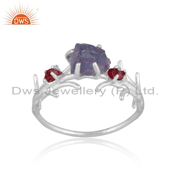 Rough Cut Spinel Ruby And Tanzanite Set Fine Silver Ring