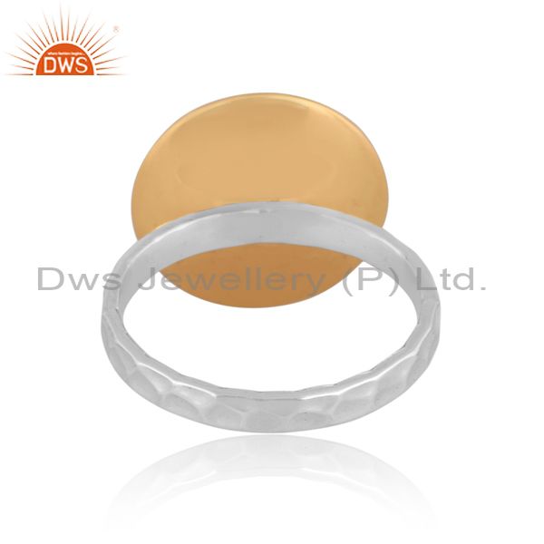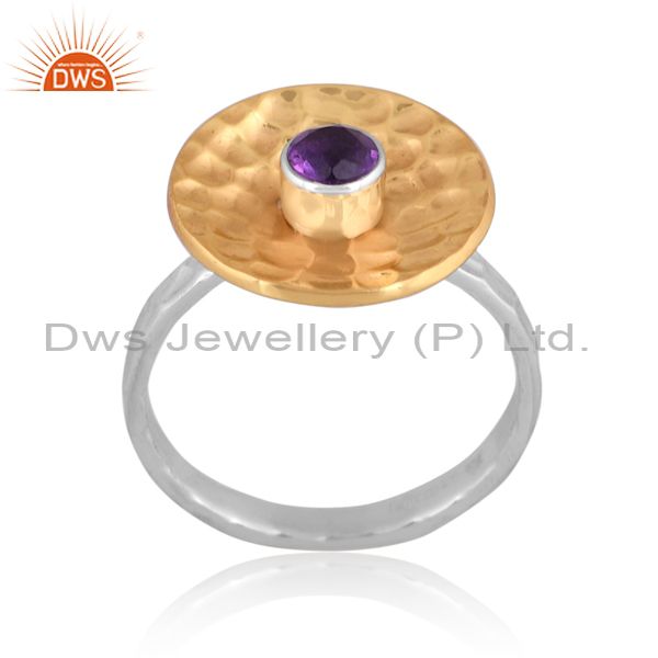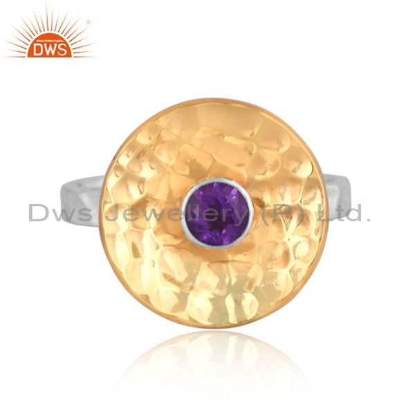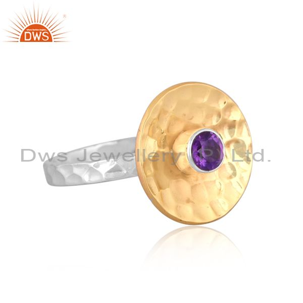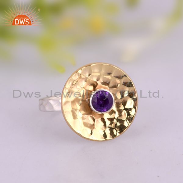 Round Amethyst Set Gold On Fine 925 Silver Handhammered Ring