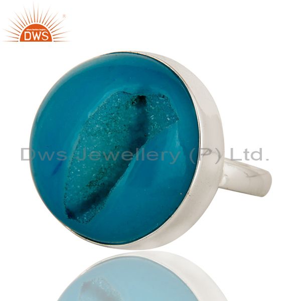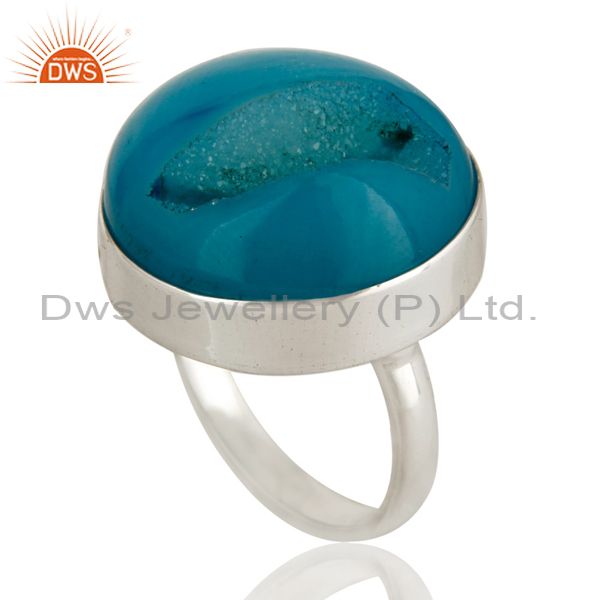 Round Blue Agate Druzy Cocktail Ring In Solid Sterling Silver