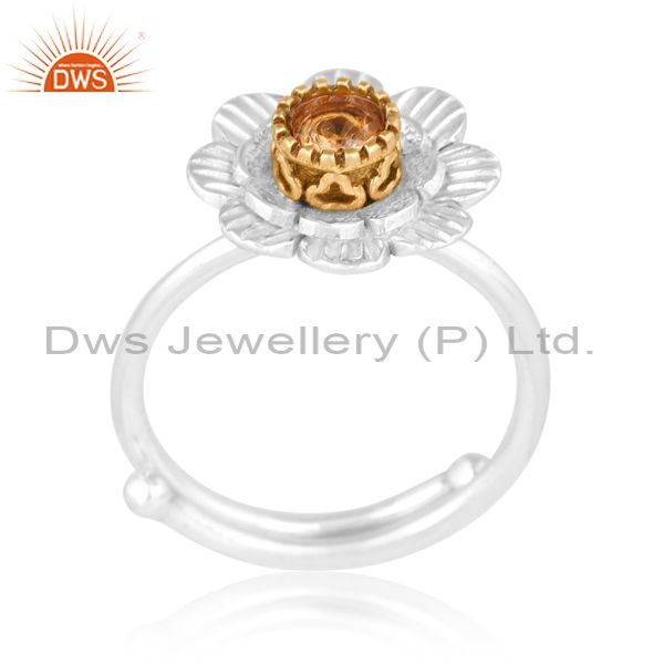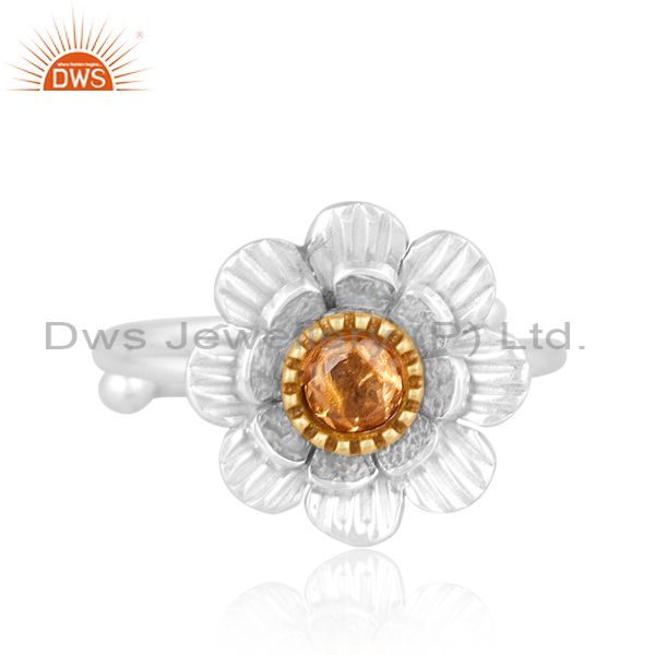Round Cut Citrine Set Gold On Fine 925 Silver Floral Ring