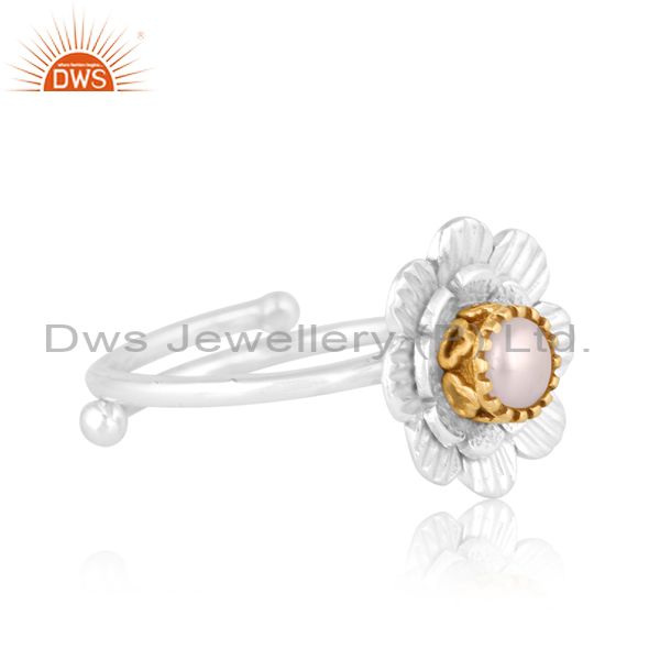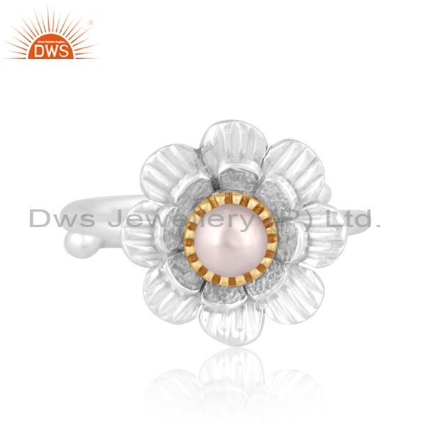 Round Pearl Set Gold On Fine 925 Silver Designer Floral Ring