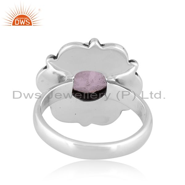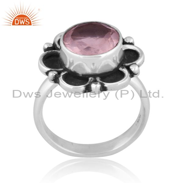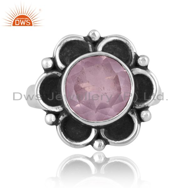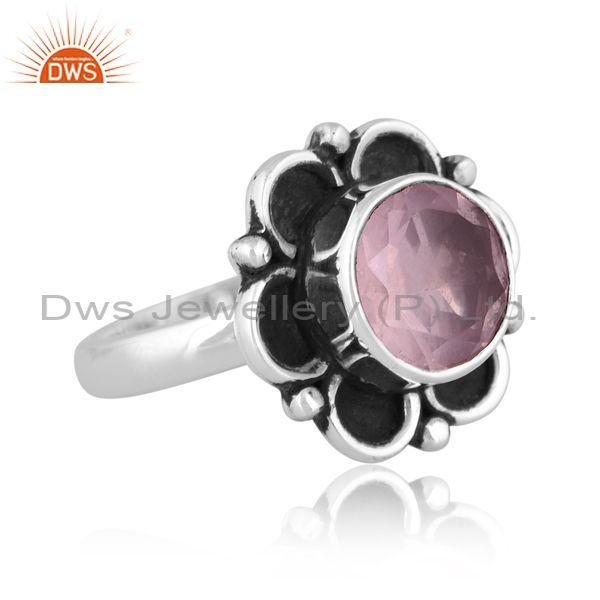 Round Rose Quartz Set Oxidized 925 Silver Classy Floral Ring