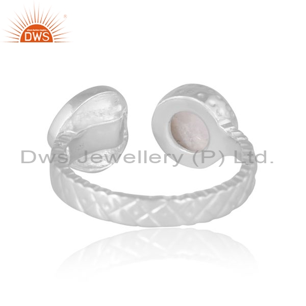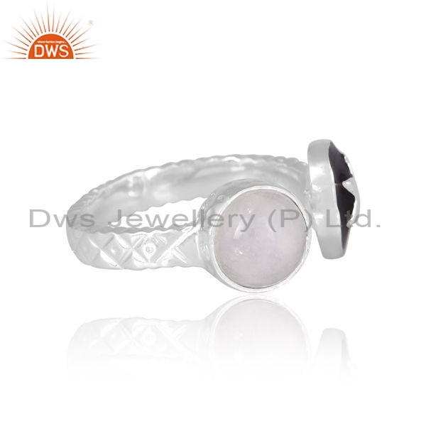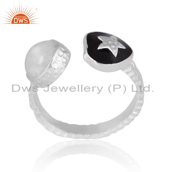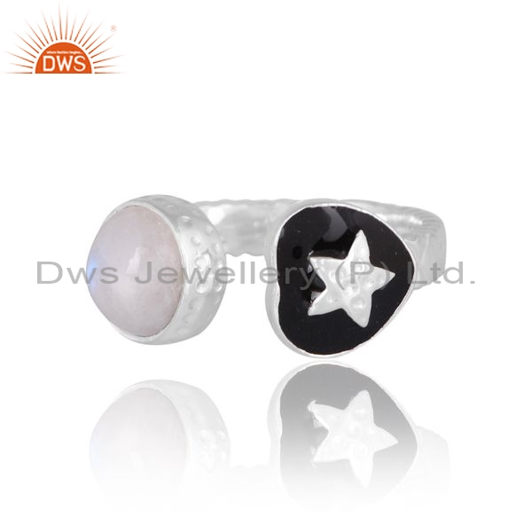 Silver Adjustable Ring With Black Enamel And Rainbow Stone