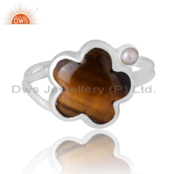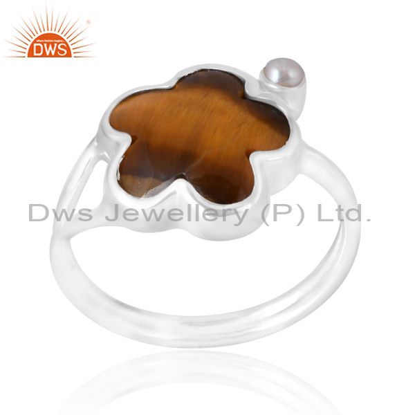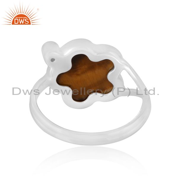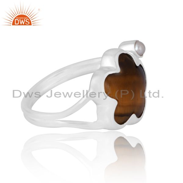 Silver Floral Pattern Tiger Eye Ring Wit A Pearly Dot Design