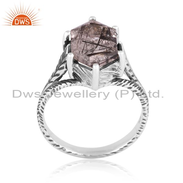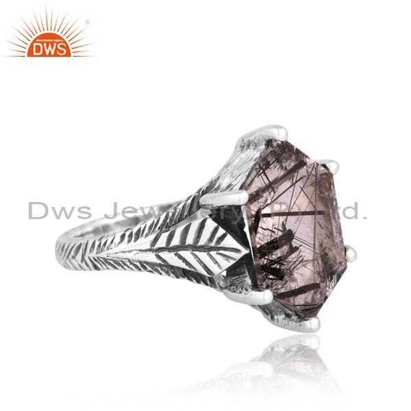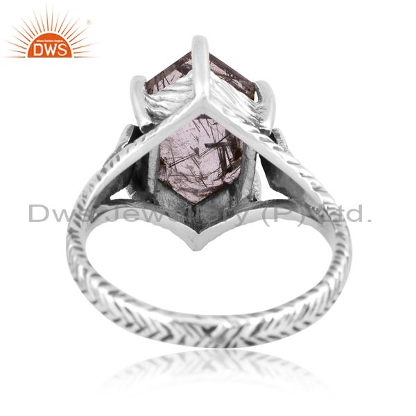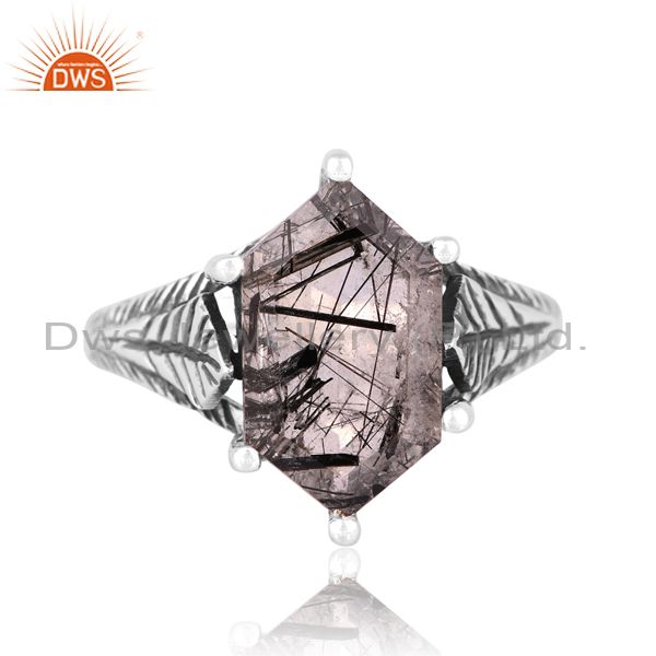 Silver Ring With Elongated Black Rutile Cut Hexagon Stone
