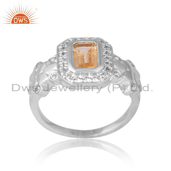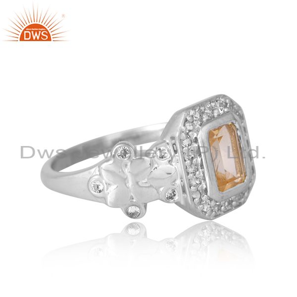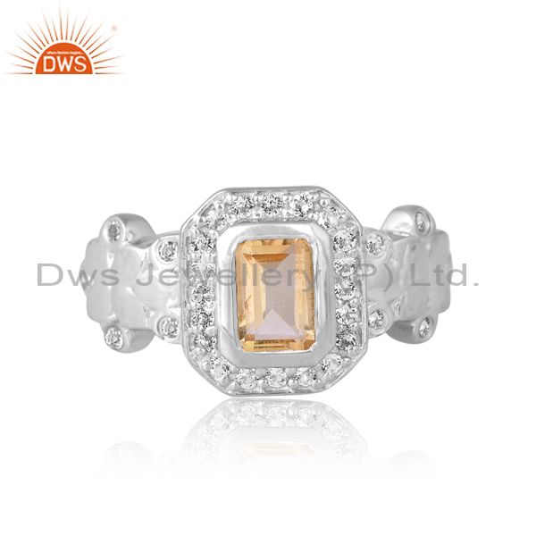 Silver White Ring With Citrine Octagon Cut And White Topaz