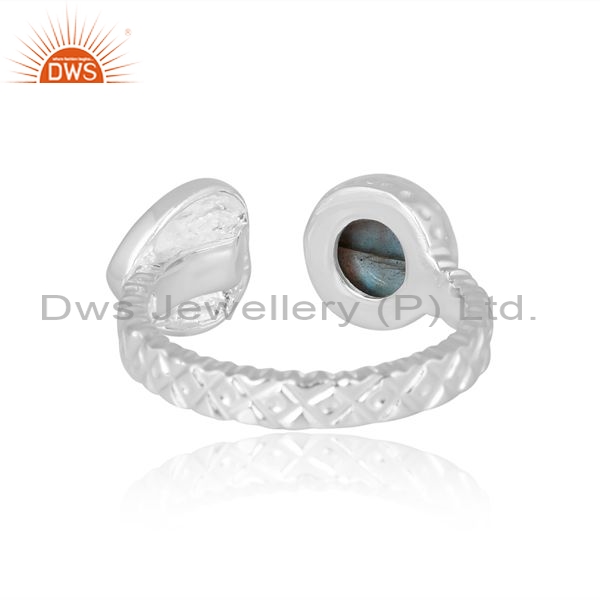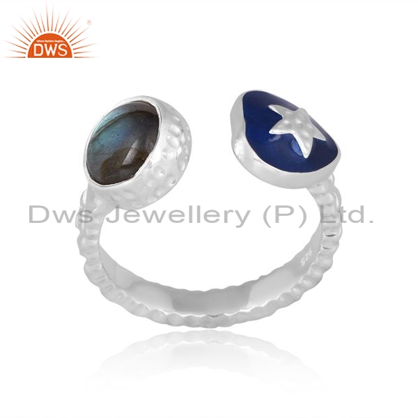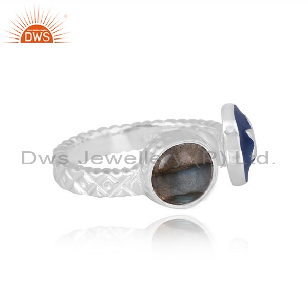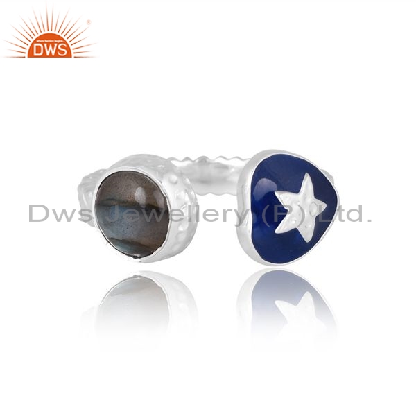 Silver White Ring With Labradorite Round Cut And Blue Enamel