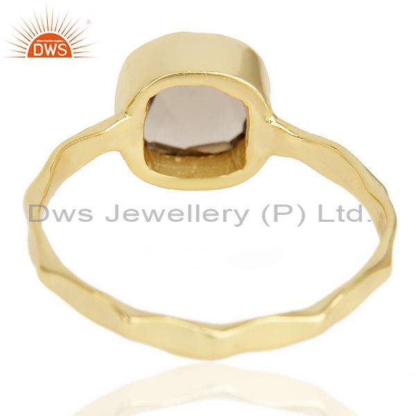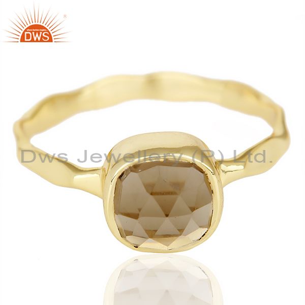 Smoky Topaz Cushion Shape Studded Gold Plated Hammered Ring In Solid Silver