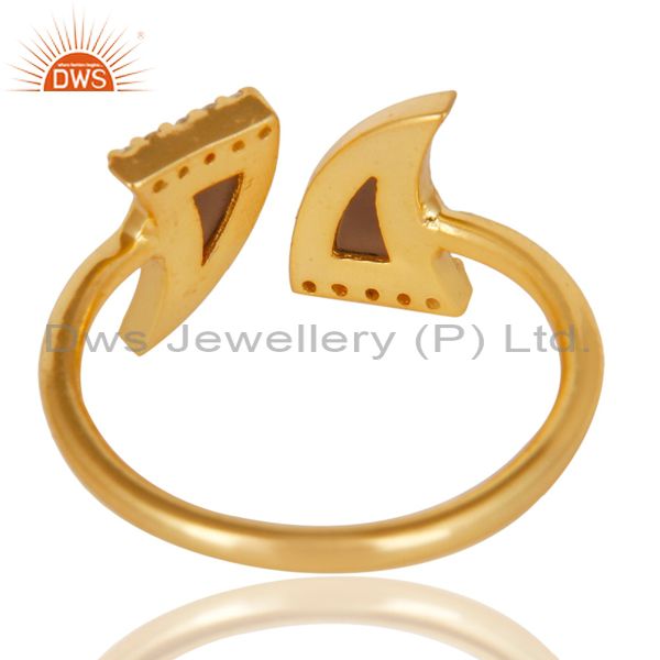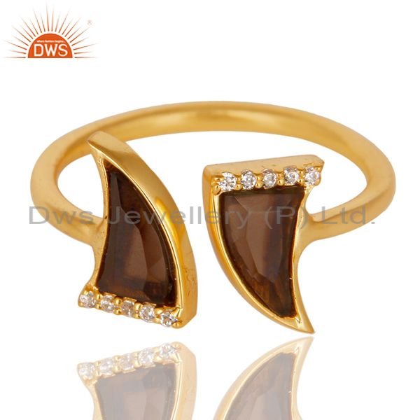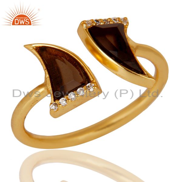 Smoky Topaz Two Horn Cz Studded Adjustable 14K Gold Plated 92.5 Silver Ring