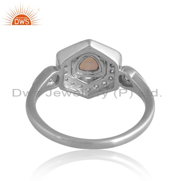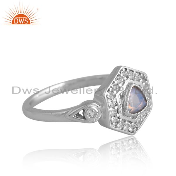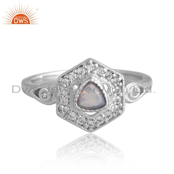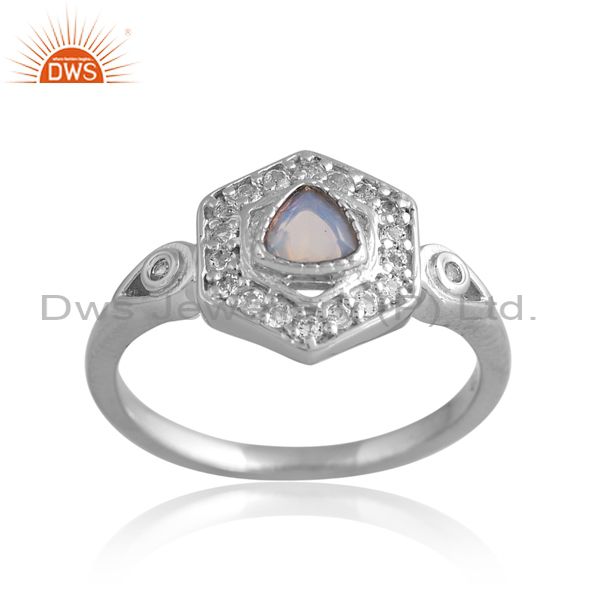 Sterling Silver White Ring With Opal And White Topaz Hexagon