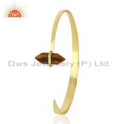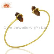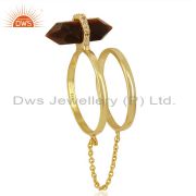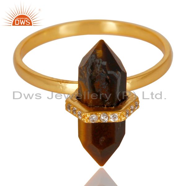 Tigereye Cz Studded Double Terminated Pencil Gold Plated Silver Ring