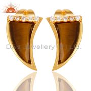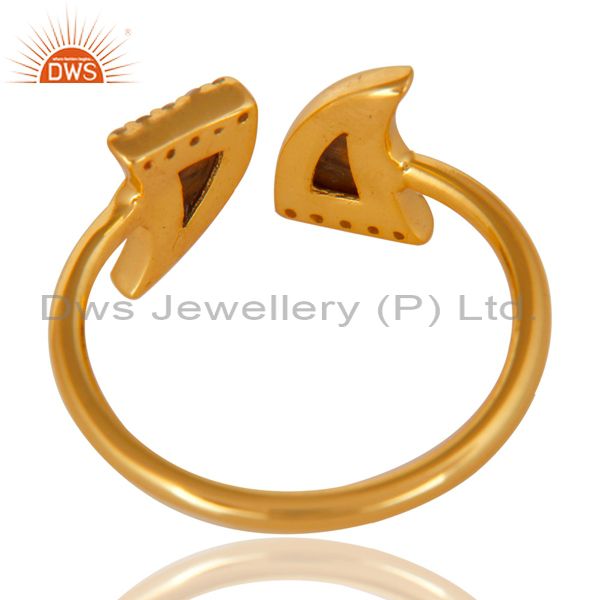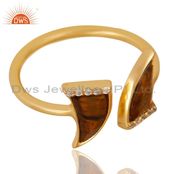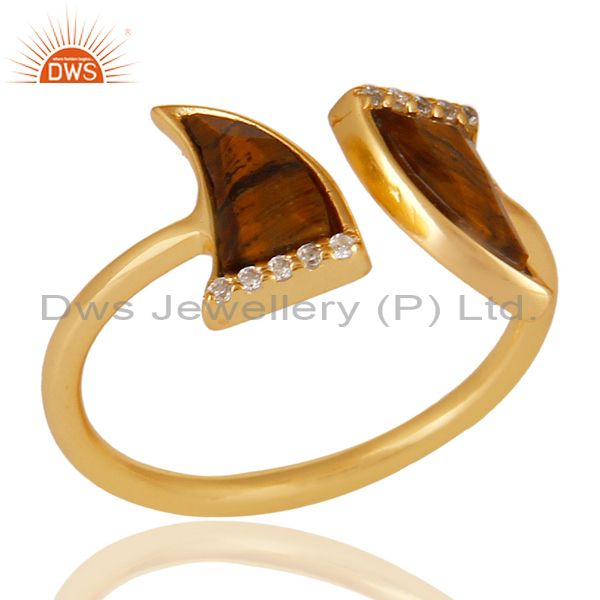 Tigereye Two Horn Cz Studded Adjustable 14K Gold Plated 92.5 Silver Ring
