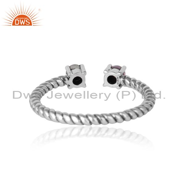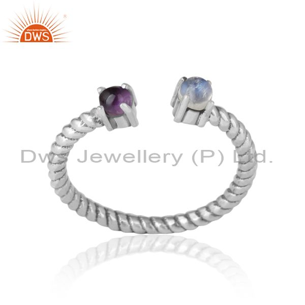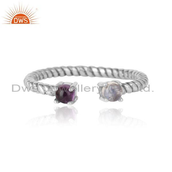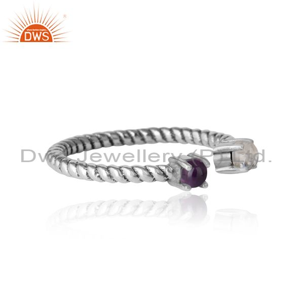 Twisted Ring in Oxidized Silver Rainbow Moonstone and Amethyst