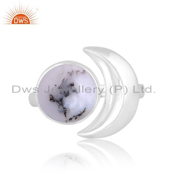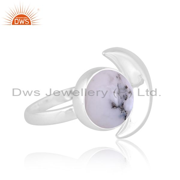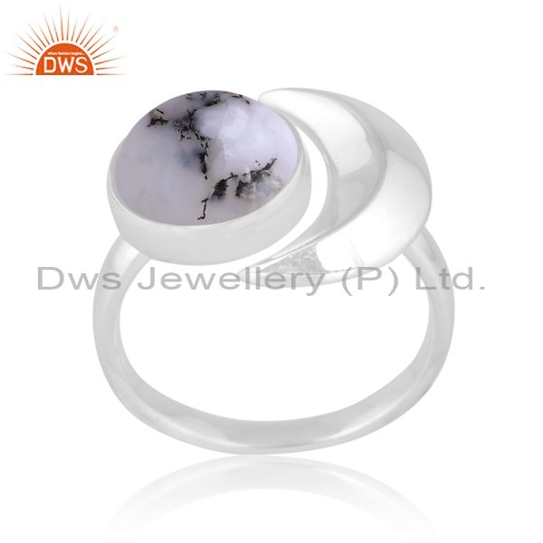 White Sterling Silver Ring With Dendrite Cabochon Round